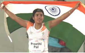 Paris, Sep 3 (IANS) Indian para-sprinter Deepthi Jeevanji won her maiden bronze in the women's 400m T20 category in the ongoing Paris Paralympics here on Tuesday. Deepthi clocked the timing of 55.82 seconds at the Stade de France to finish behind Ukraine's Yuliia Shuliar (55.16 secs) and Turkiye's world record holder Aysel Onder (55.23 secs).