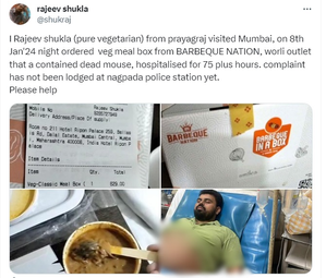 Mumbai, Jan 16 (IANS) In a shocking incident, Adv. Rajeev Shukla, a visiting lawyer from Uttar Pradesh’s Prayagraj allegedly received a vegetarian meal parcel from Barbeque Nation which contained a dead rat and some roaches, as per his social media posts.
