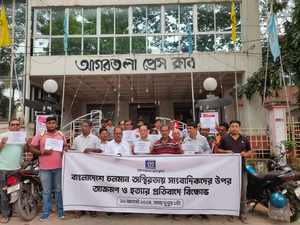 Agartala, Aug 11 (IANS) Expressing solidarity and protesting the killing of journalists, attacks and action against media persons in violence-torn Bangladesh, senior journalists and members of the Agartala Press Club on Sunday held a protest.
