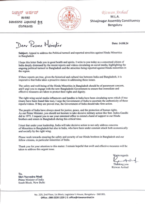 Bengaluru, Aug 15 (IANS) Karnataka Congress MLA Rizwan Arshad on Wednesday wrote a letter to Prime Minister Narendra Modi, appealing him to address the political turmoil and reported atrocities on Hindu minorities in Bangladesh.