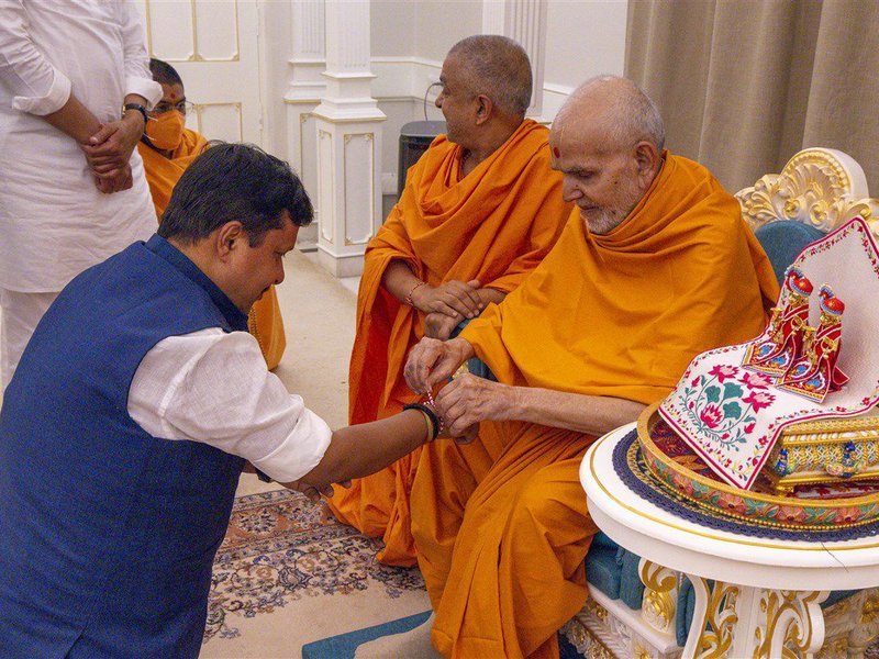 Gandhinagar, Feb 21 (IANS) On his maiden visit to Gujarat after assuming office as National President of the BJP, Nitin Nabin paid a courtesy visit to His Holiness Mahant Swami Maharaj at the revered Swaminarayan Akshardham in Gandhinagar.